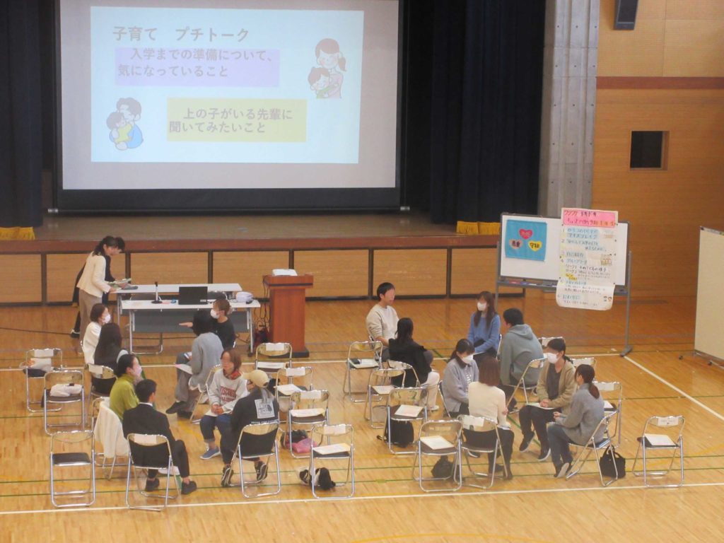 長浜小学校の就学時健診にあわせて子育て学習会を行いました。アイスブレイク「よろしグー」で打ち解けた後、「わくわくドキドキちょっとはらはら新1年生」をテーマにミニ講話やグループワークを行いました。入学前に準備しておいたらよいことの中では、「早寝早起き、朝の身支度、横断歩道の渡り方、和式トイレの使い方など」、共通の話題が数多く出ました。